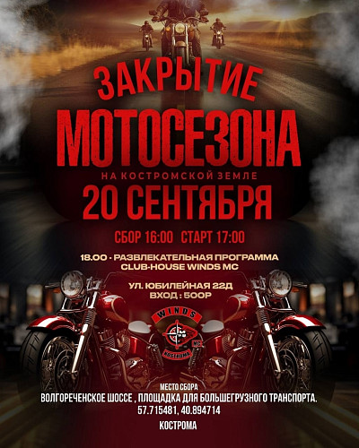 Закрытие мотосезона 2025 в Костроме состоится 20 сентября. Возглавляет колонну WINDS MC KOSTROMA