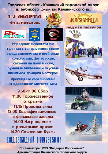 Гостей ждут масленичные гуляния, проводы зимы, гонки на мотоциклах, квадроциклах и снегоходах, детская программа, блинчики и вкусная еда, катание на пони и многое другое!